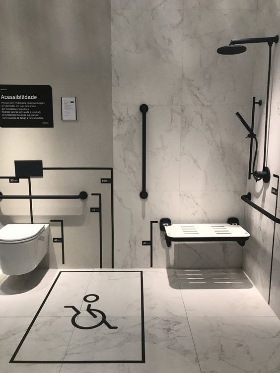 Os banheiros são adaptados com equipamentos modernos para atender às necessidades de pessoas com deficiência, proporcionando conforto e autonomia.
